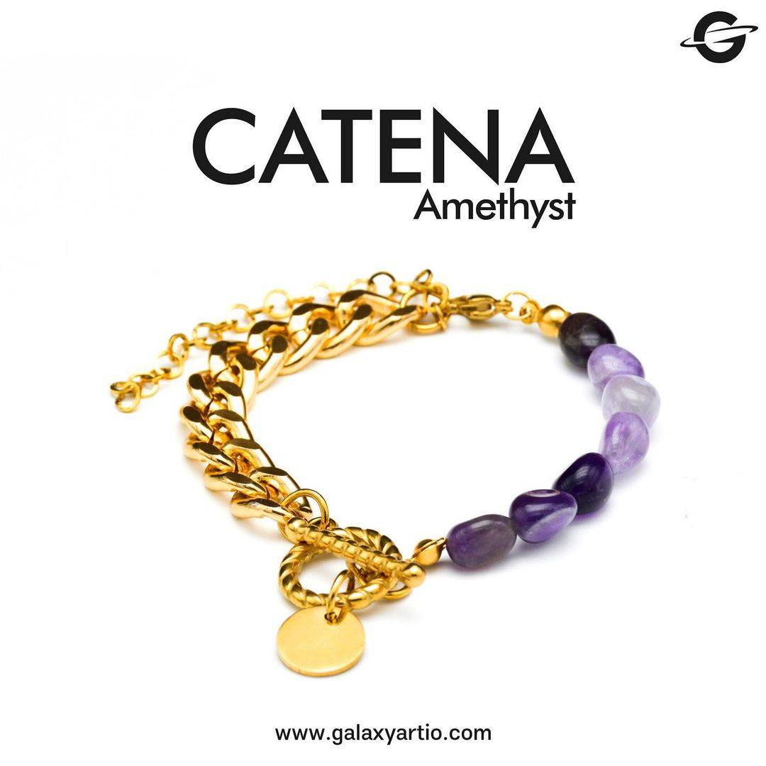 دستنبد کاتنا متشکل از سنگ های زیبا و قیمتی آمیتیست و زنجیر کارتیر است که زیبایی آن را دو چندان کرده است. قفل استیل رنگ ثابت برای تنظیم مناسب دست شما در پشت دستبند تعبیه شده است. سنگ آمیتیست از خواص بسیاری برخوردار است که در ادامه به بررسی آنها می پردازیم.