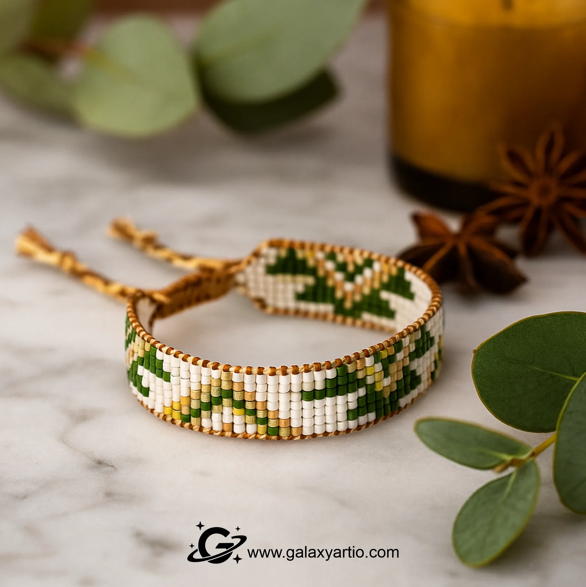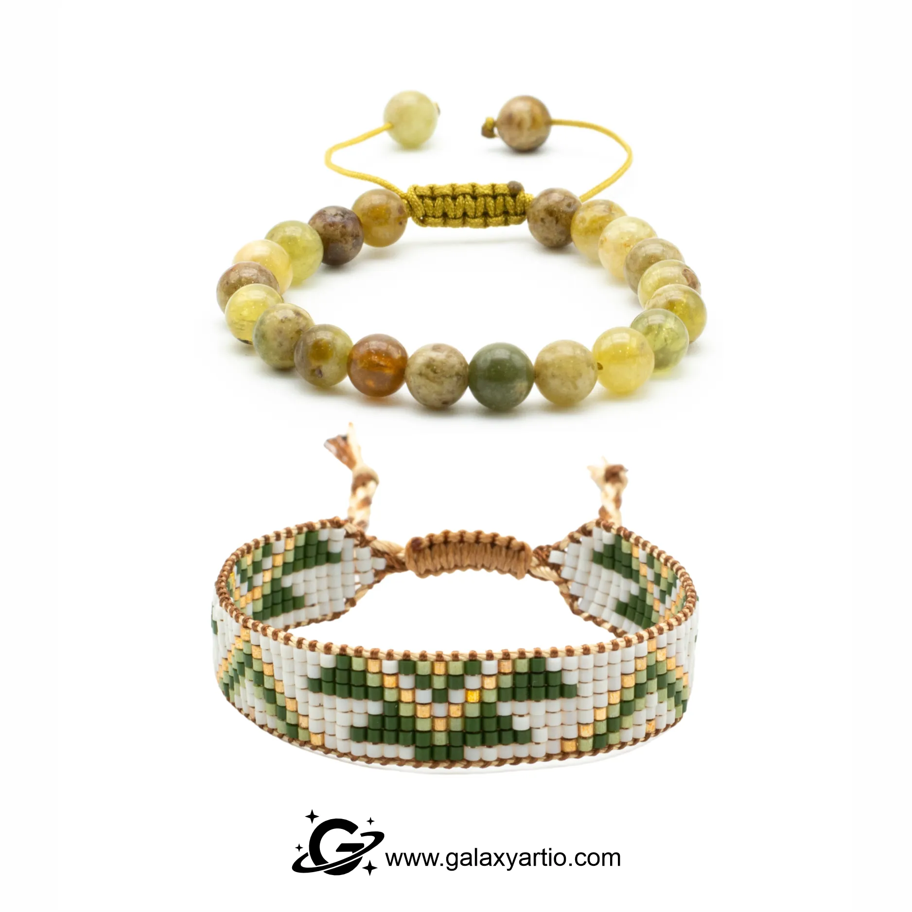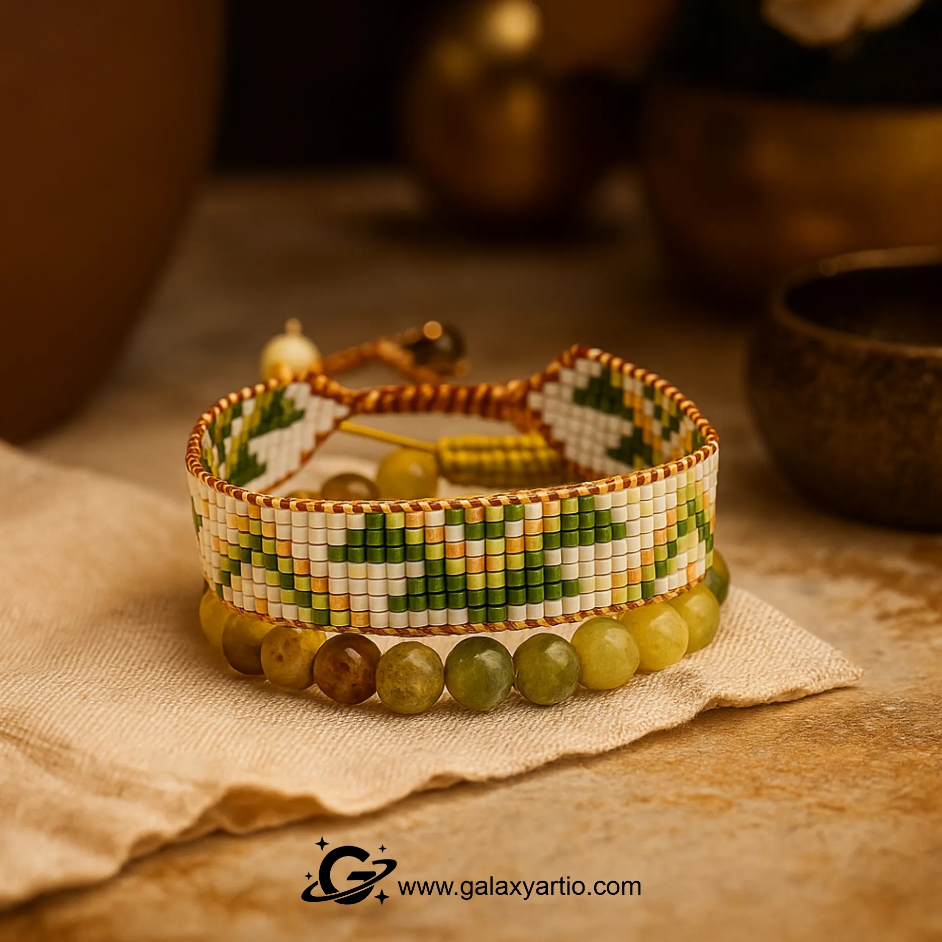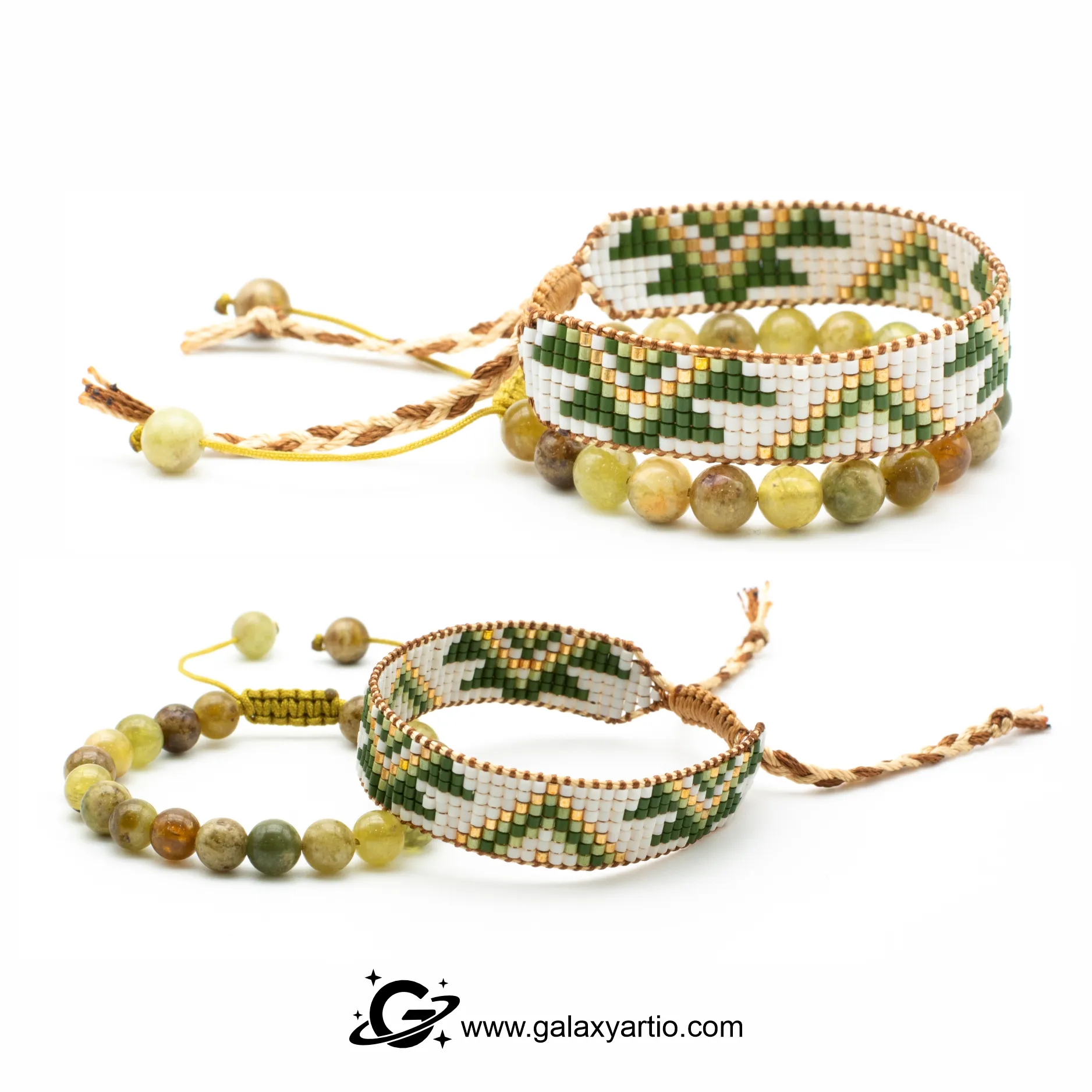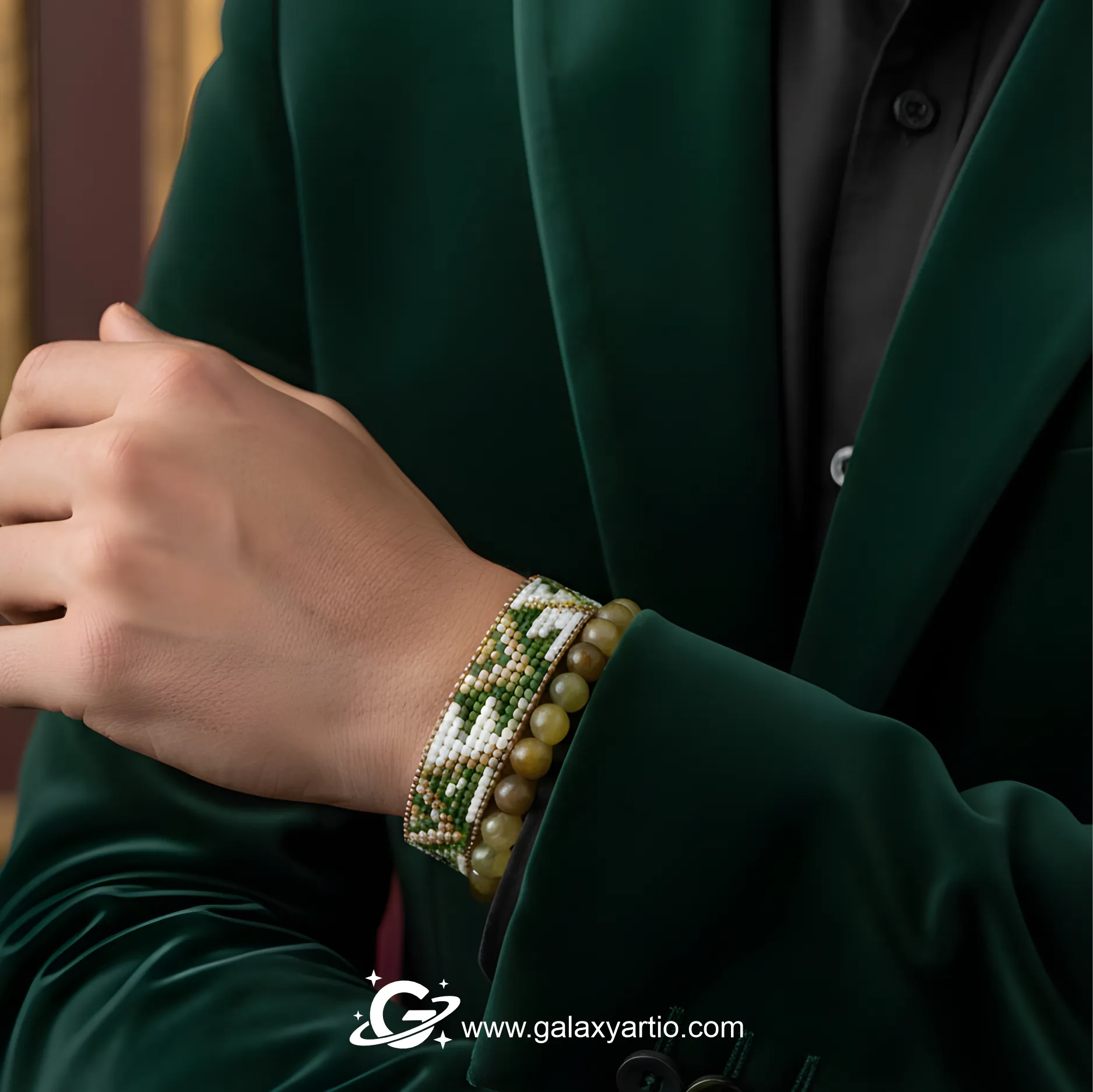 دستبند میوکی در ست اترنال با ترکیب سبز و سفید و طلایی ساخته شده؛ سبز نماد رشد، حیات و انرژی زمین و سفید نماد پاکی، آرامش و الهام روح.