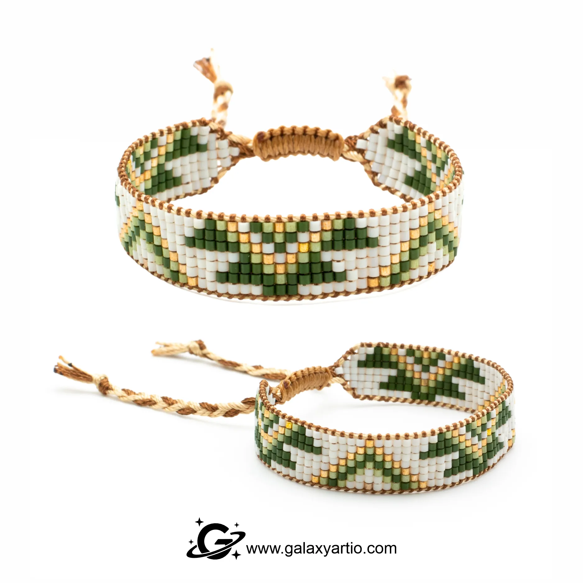 ۲) دستبند میوکی دست ساز با منجوق های اصل ژاپن، ترکیب سبز و سفید و طلایی