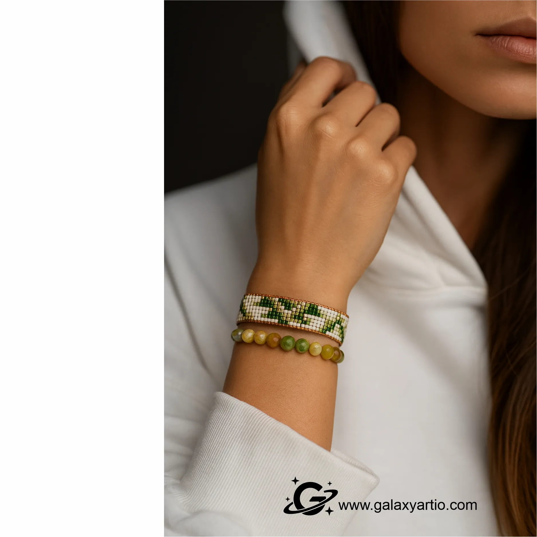 در کنارش، دستبند دستساز میوکی سبز و سفید مثل هالهای از نور و آرامش، لطافت طبیعت را روی مچت مینشاند، این دو دستبند در کنار هم نماد حیات، شفافیت و ثروت درونی و بیرونی هستند؛الهام بخش رسیدن به هدف ها و رهایی از محدودیت ها.