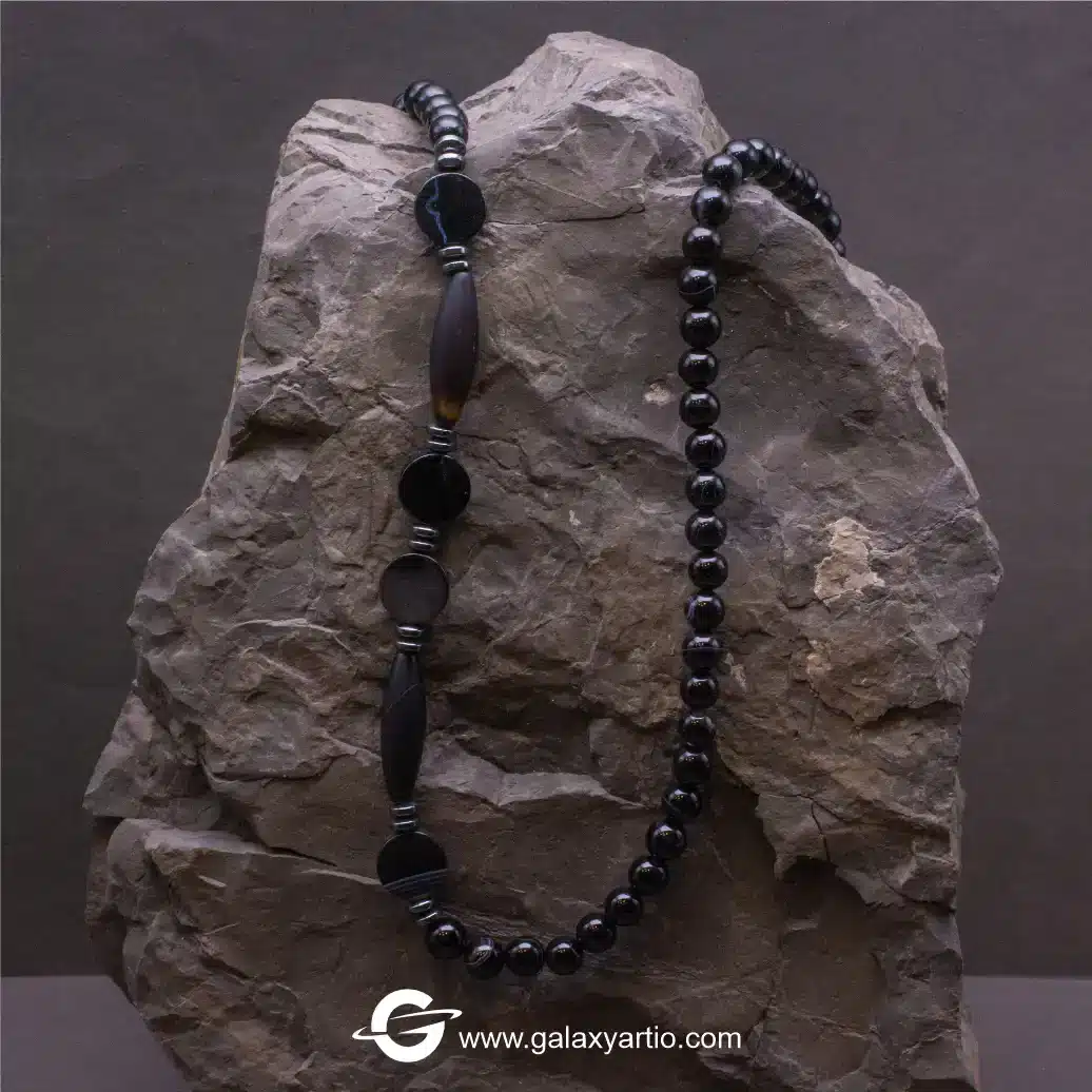 گردنبند سایه از سنگ عقیق سیاه بوتسوانا (Botswana Black Agate) ساخته شده است. این سنگ به دلیل رنگ مشکی عمیق و الگوهای منحصر به فردش، به زیبایی و جذابیت هر جواهر افزوده و به گردنبند جلوهای مدرن و شیک میبخشد.