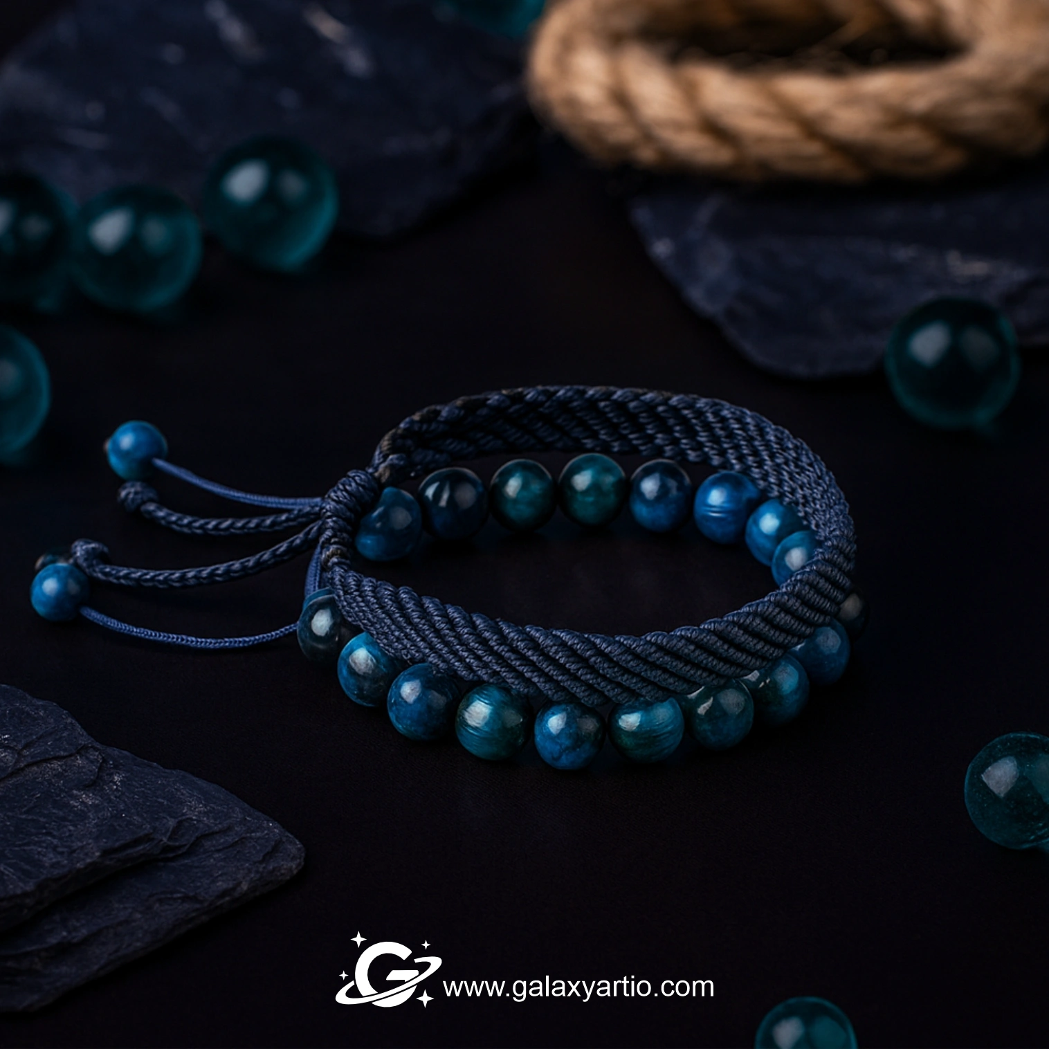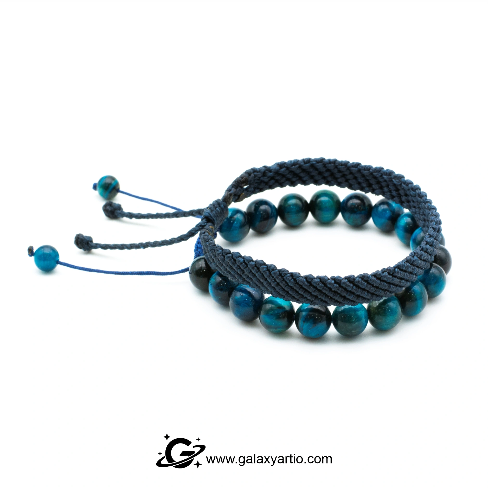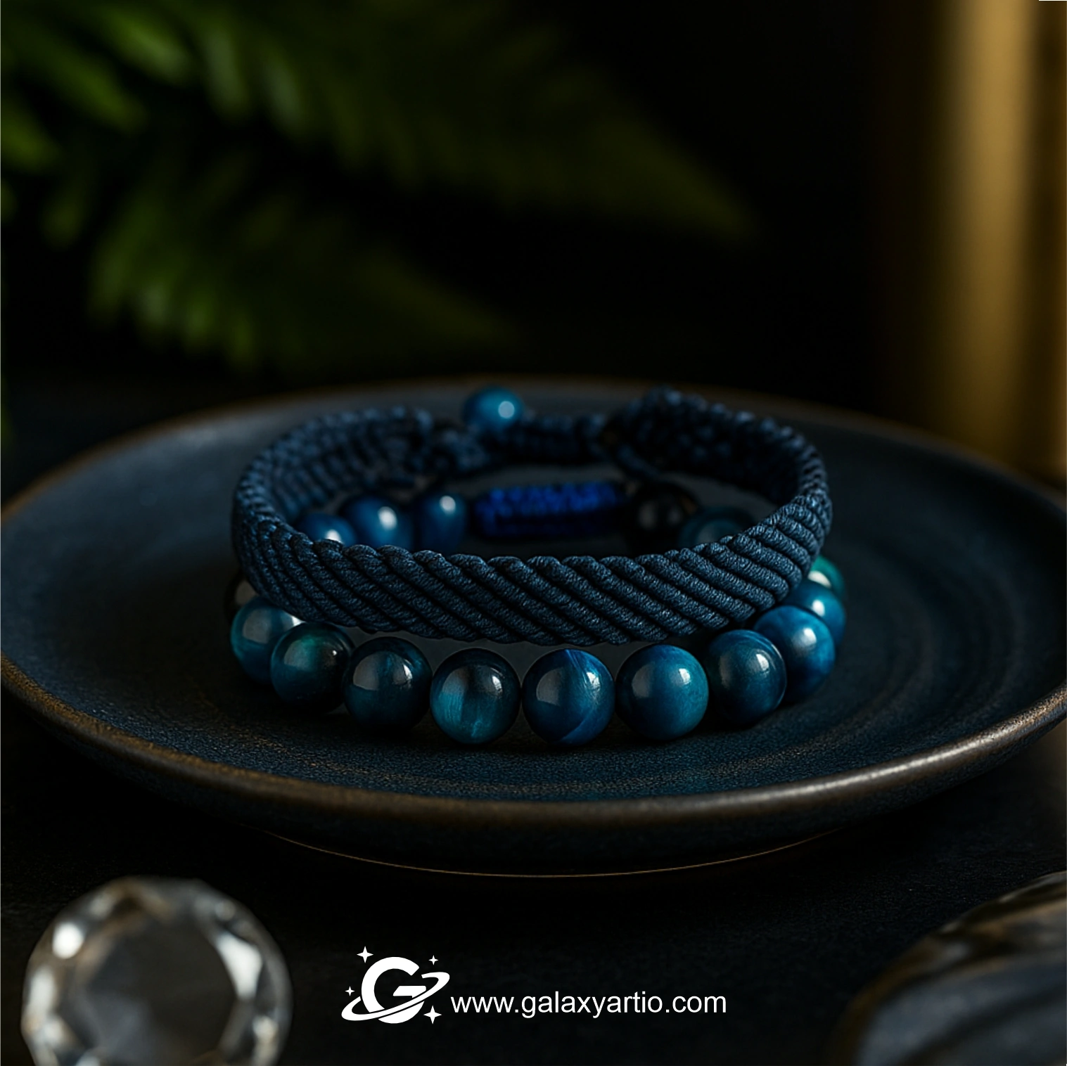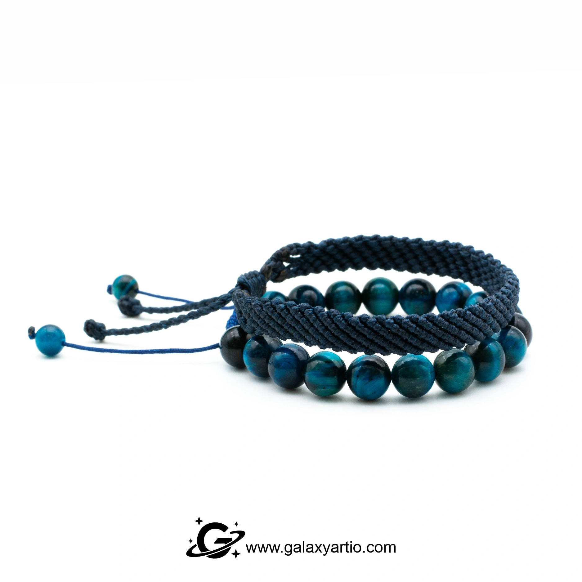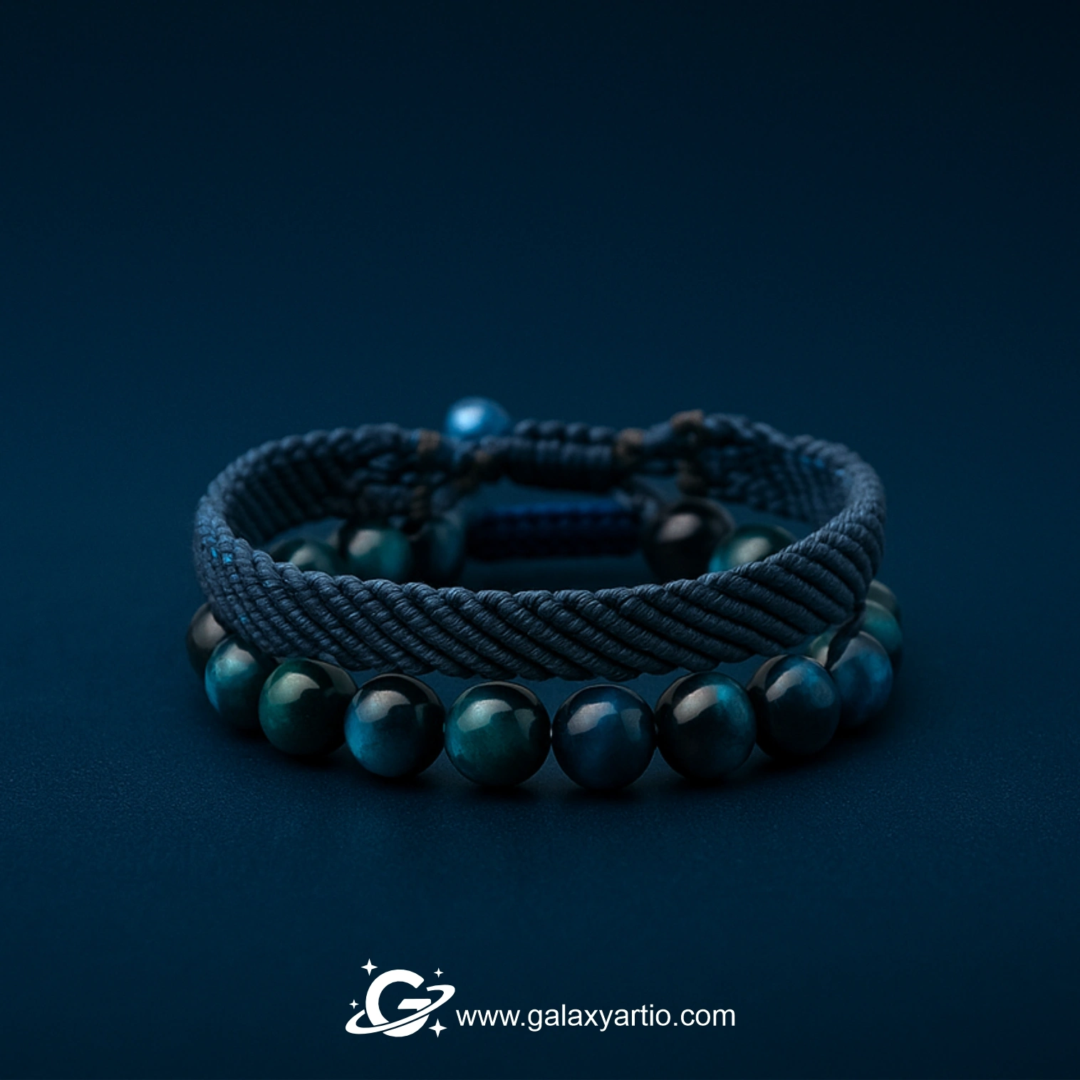 دستبند ست نپتون ترکیبی خاص و چشمگیر از سنگ طبیعی چشم ببر آبی (Blue Tiger’s Eye) و یک دستبند مکرومه بافت دست ساز است که به استایل شما جلوه ای مدرن، شیک و انرژی بخش میدهد. این ست به صورت فری سایز با بند تنظیمی طراحی شده تا برای خانم ها و آقایان قابل استفاده باشد و به راحتی با هر استایلی ست شود.