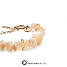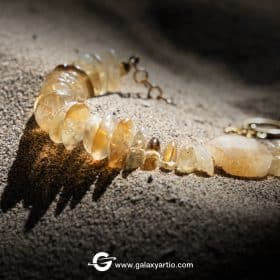 - سنگ سیترین با تراشهای خاص: این دستبند با استفاده از سنگ سیترین با دو تراش خاص طراحی شده است. تراشهای خاص بهطور ویژه به نور و رنگ سنگ سیترین ابعاد جدیدی میبخشند و زیبایی آن را دوچندان میکنند. تراشهای دقیق باعث میشود که سنگ سیترین نور را بهتر بازتاب دهد و جلوهای بینظیر داشته باشد.