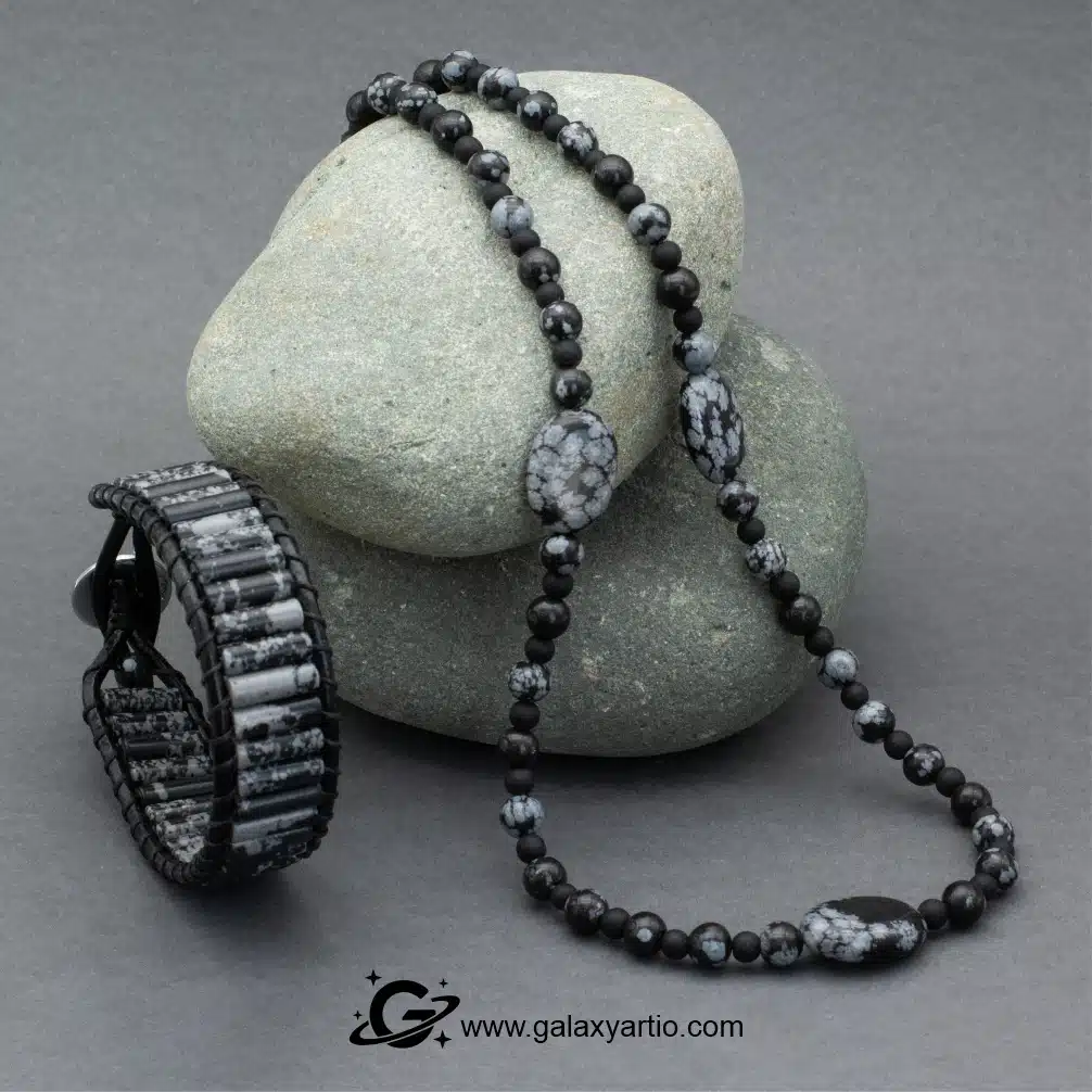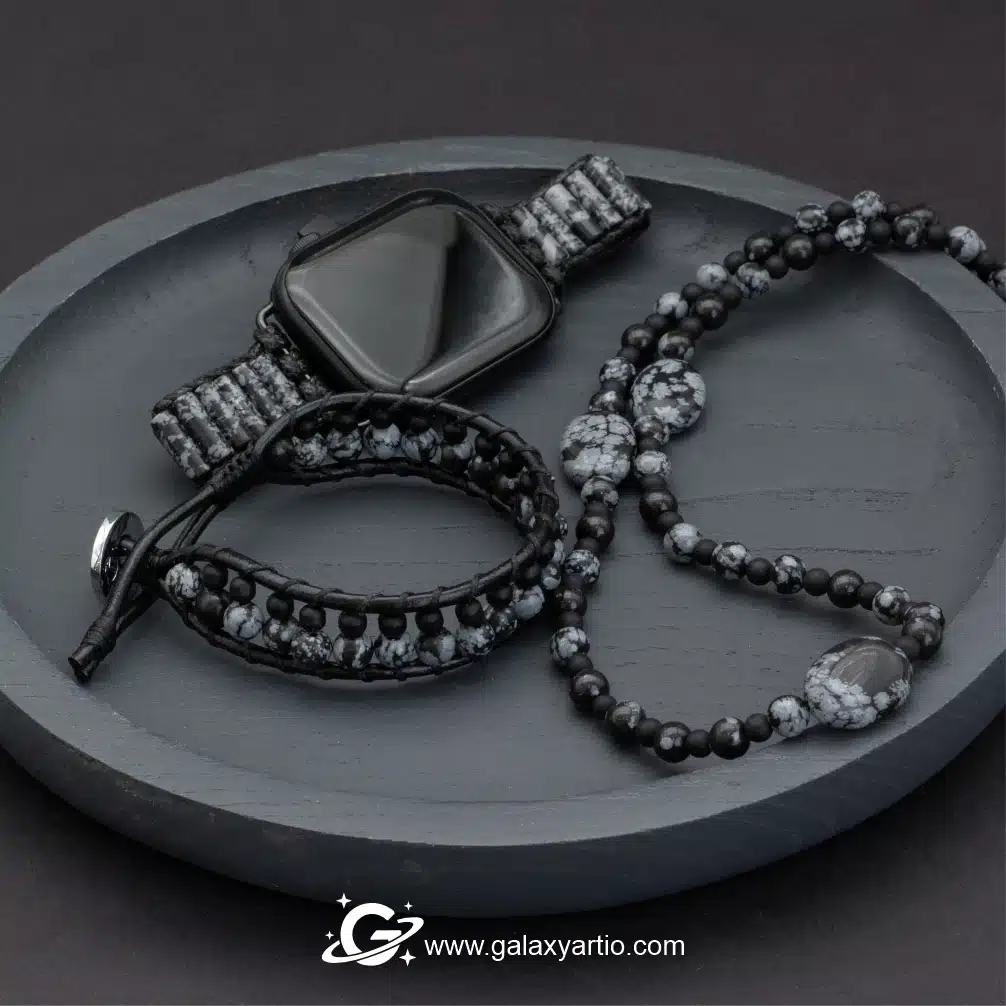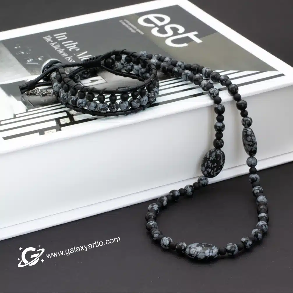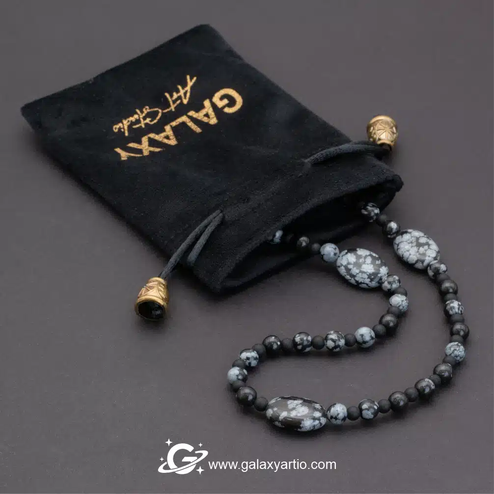 سنگ آبسیدین لکه برفی (Snowflake Obsidian) با رگه های سفید و خاکستری بر زمینه ای مشکی، نمایی شبیه به برف روی سنگ آتشفشانی دارد. این سنگ نماد پاکسازی ذهن از افکار منفی و افزایش آرامش درونی است. در کنار آن، سنگ اونیکس مات (Matte Onyx) با ظاهری مات و لطیف، حس ثبات، تمرکز و محافظت در برابر انرژی های منفی را به همراه دارد. این دو سنگ در کنار هم، انرژی قدرتمند و طراحی خیره کنندهای را خلق کردهاند.