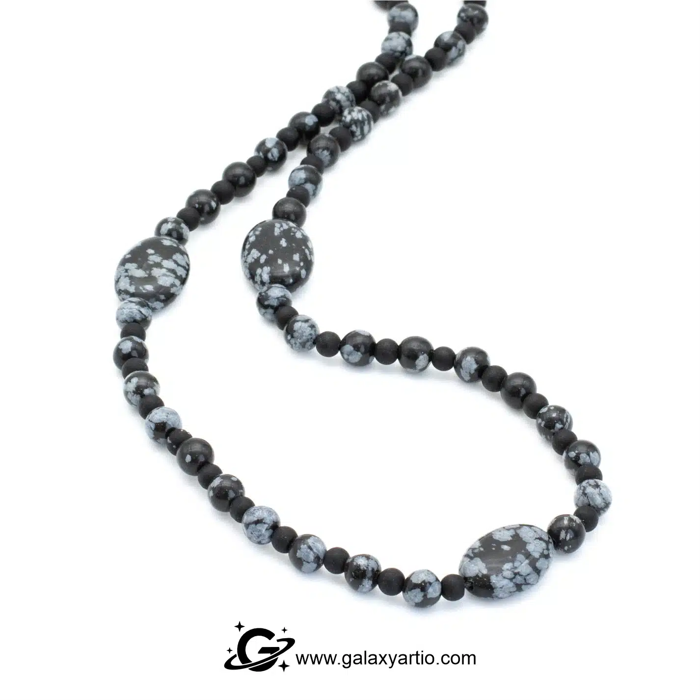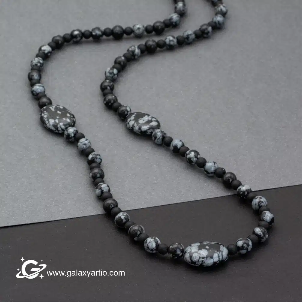 اگر به دنبال یک گردنبند سنگی متفاوت با انرژی عمیق، طراحی خاص و کیفیت بالا هستید، گردنبند اودیسه (Odyssey Necklace) یکی از انتخاب های ممتاز در میان زیورآلات طبیعی گلکسی آرت است. این گردنبند دست ساز از ترکیب دو سنگ جذاب و قدرتمند ساخته شده: آبسیدین لکه برفی و اونیکس مات – دو سنگ با جلوهای تاریک، مرموز و بسیار شیک که نماد قدرت درونی، تعادل و تمرکز هستند.