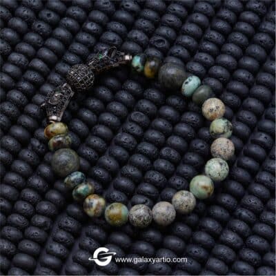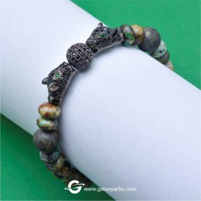 - فیروزه آفریقایی: فیروزه آفریقایی با رنگهای آبی و سبز خاص خود، به دستبند پانترز زیبایی و رنگی منحصر به فرد میبخشد و به دلیل خواص انرژیزا و زیبایی خود محبوب است.
