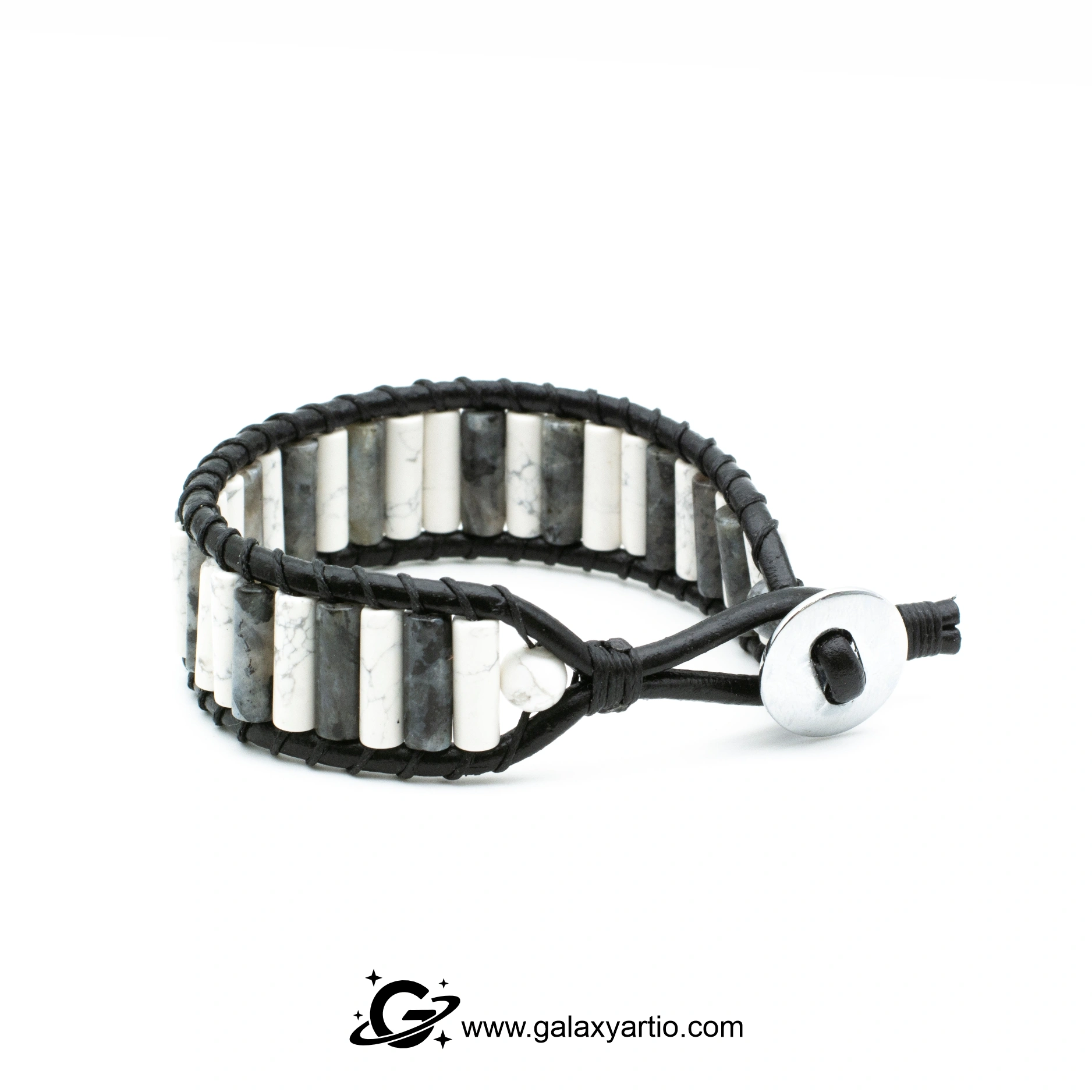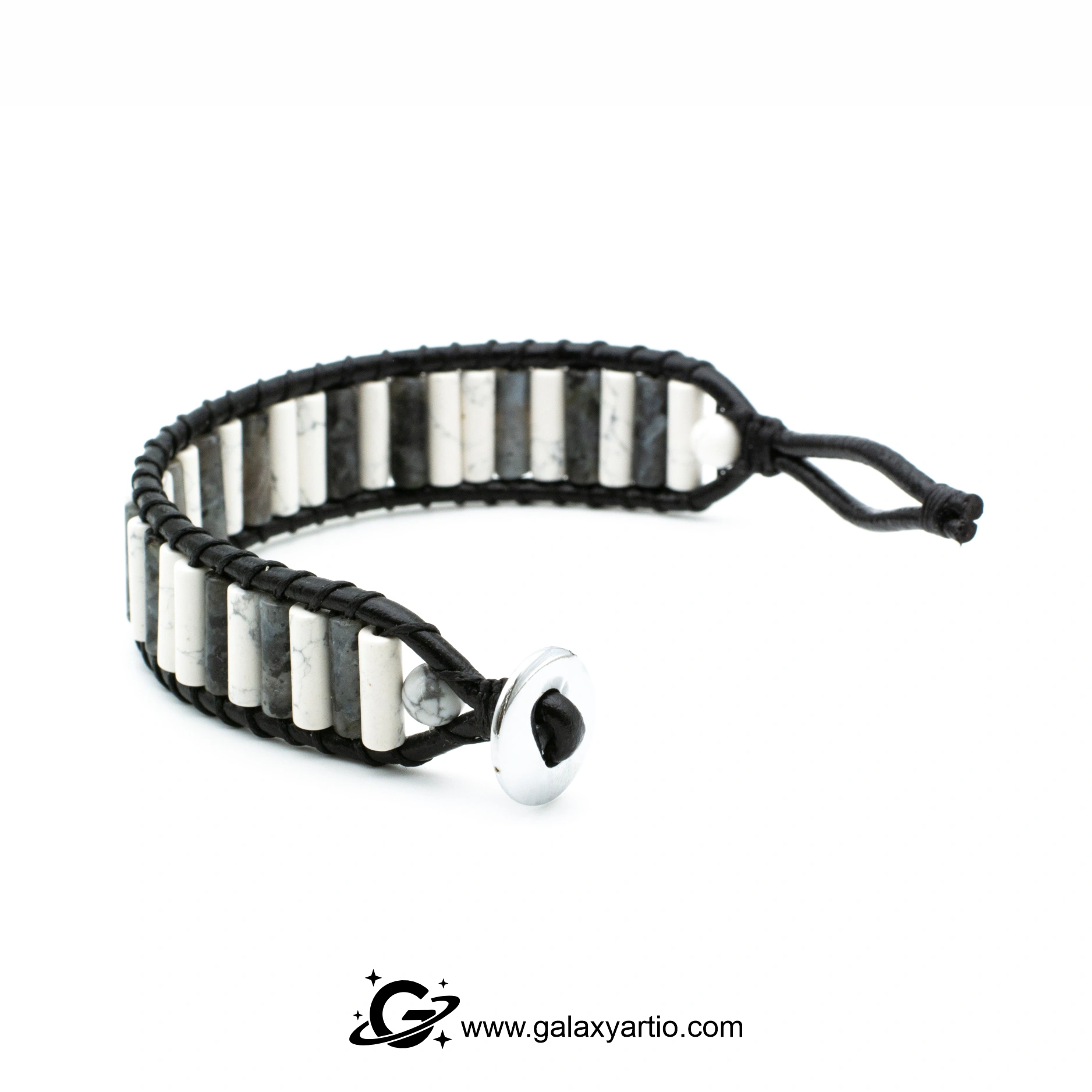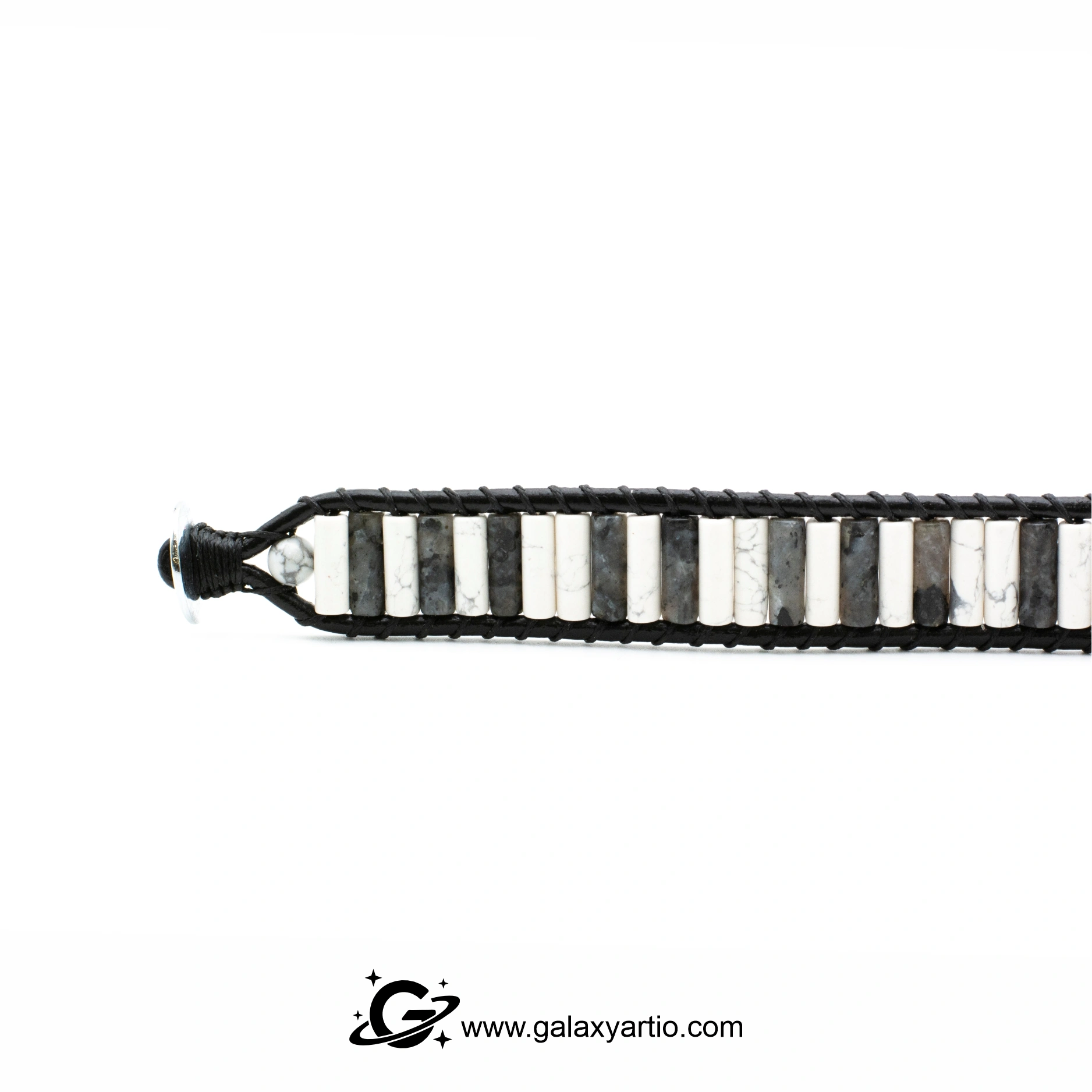ترکیب سنگ های هائولایت و لارویکیت نقرهای در کنار بند چرم طبیعی و دکمه استیل دست ساز،