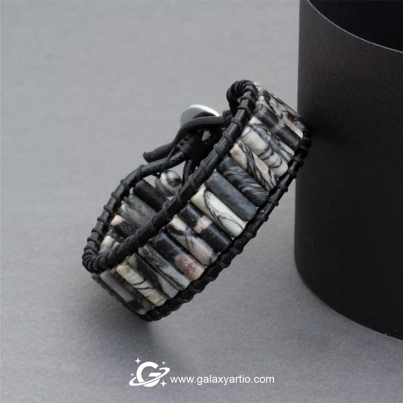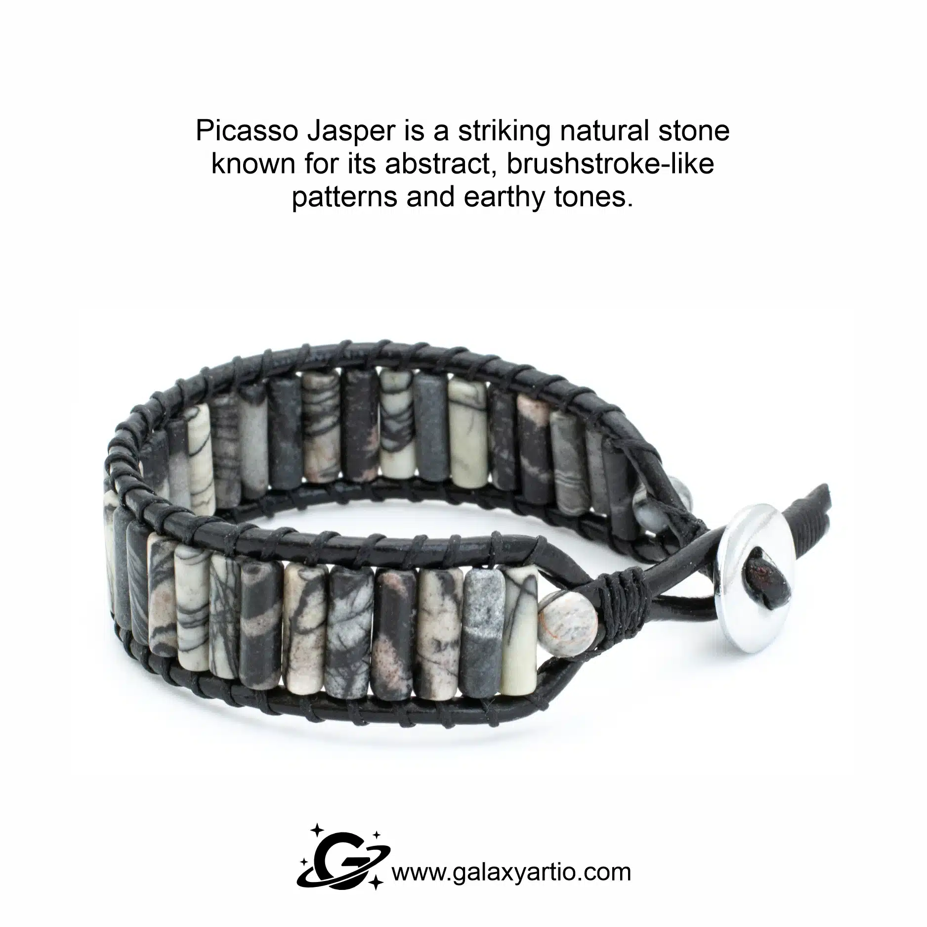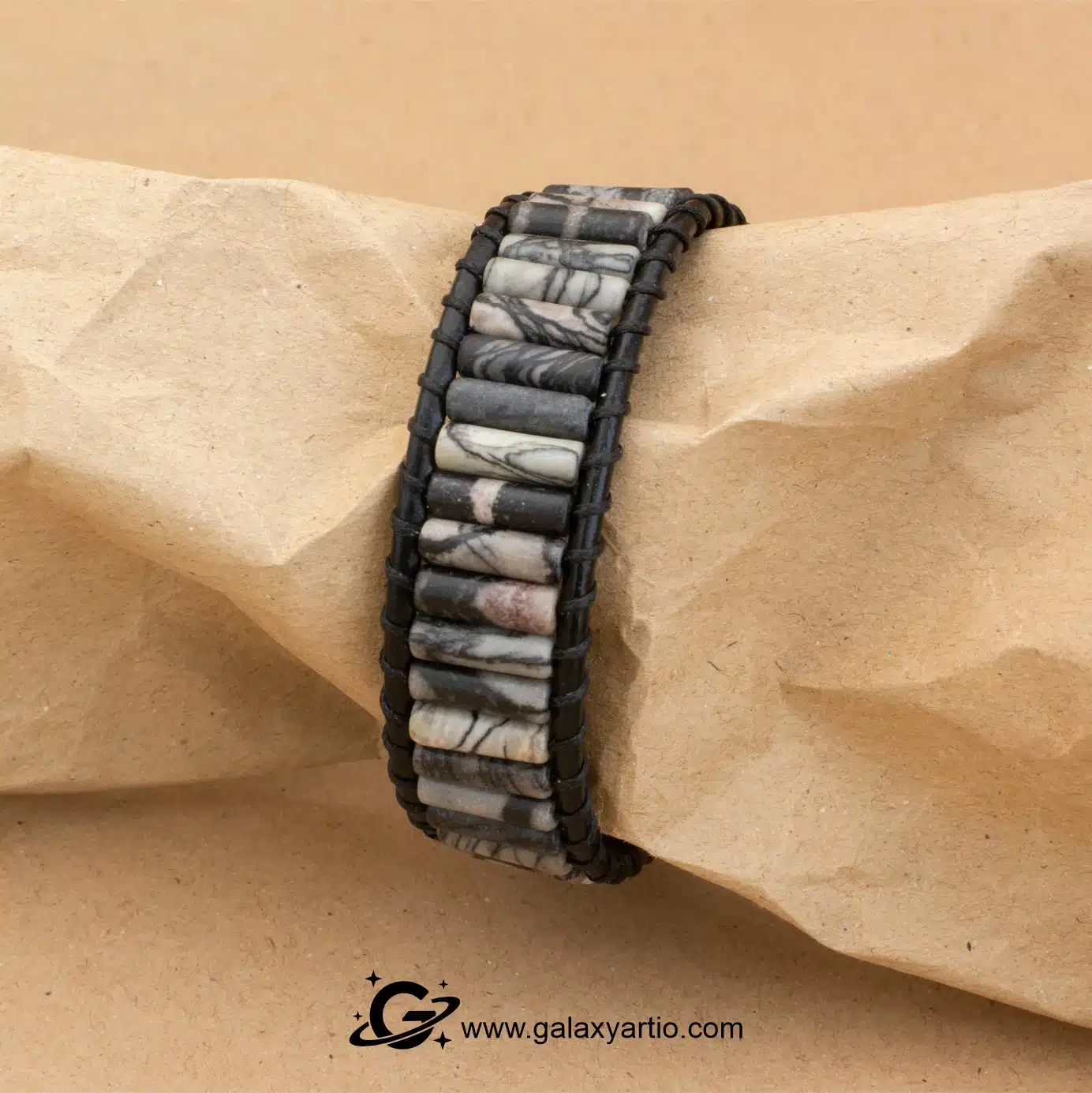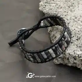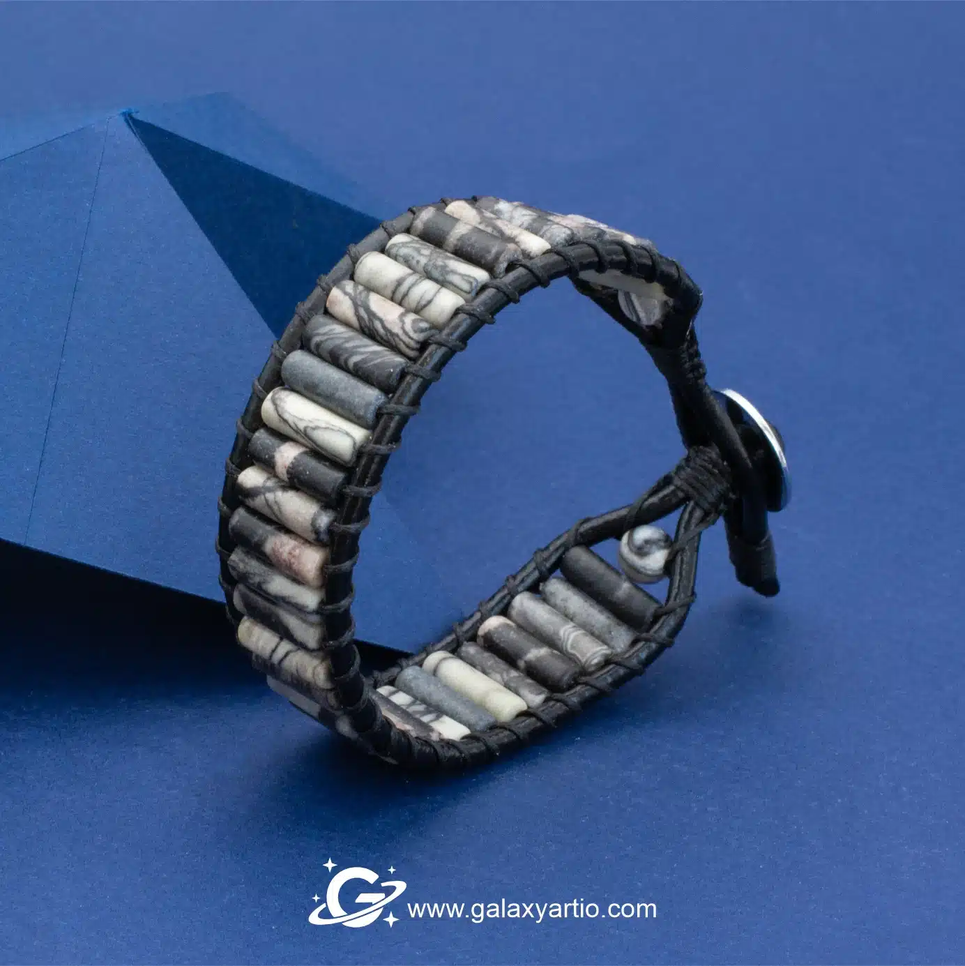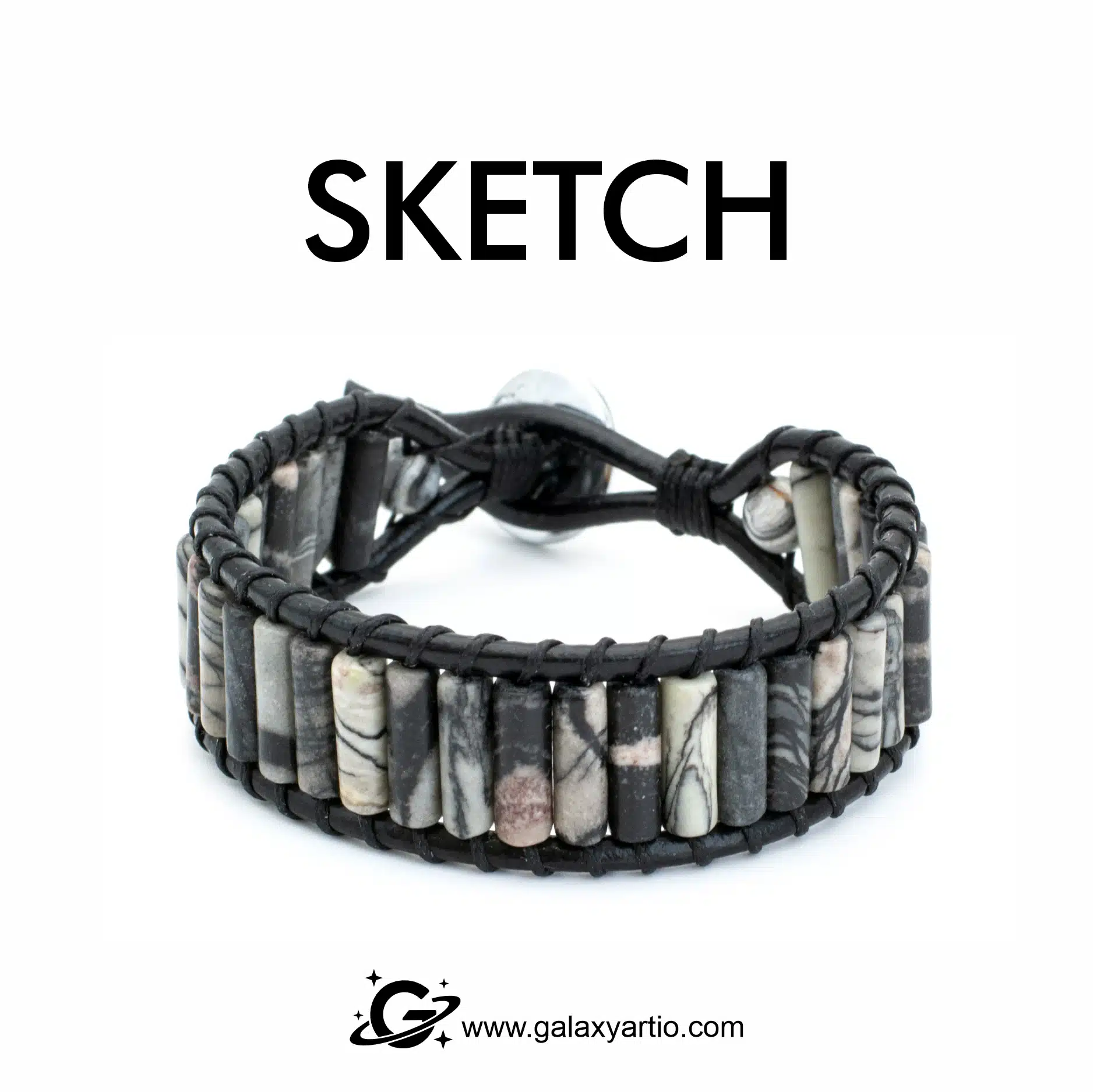 دستبند اسکچ یک اثر دست ساز منحصر به فرد است که از چرم طبیعی، سنگ جاسپر پیکاسو با تراش خاص و دکمه استیل دست ساز رنگ ثابت ساخته شده. طراحی این دستبند الهام گرفته از خطوط آزاد و درهم هنری ست؛ درست مثل طرح های طبیعی و خط خطی سنگ های جاسپر پیکاسو که هرکدام مثل یک تابلوی نقاشی انتزاعی و بیتکرار هستند.