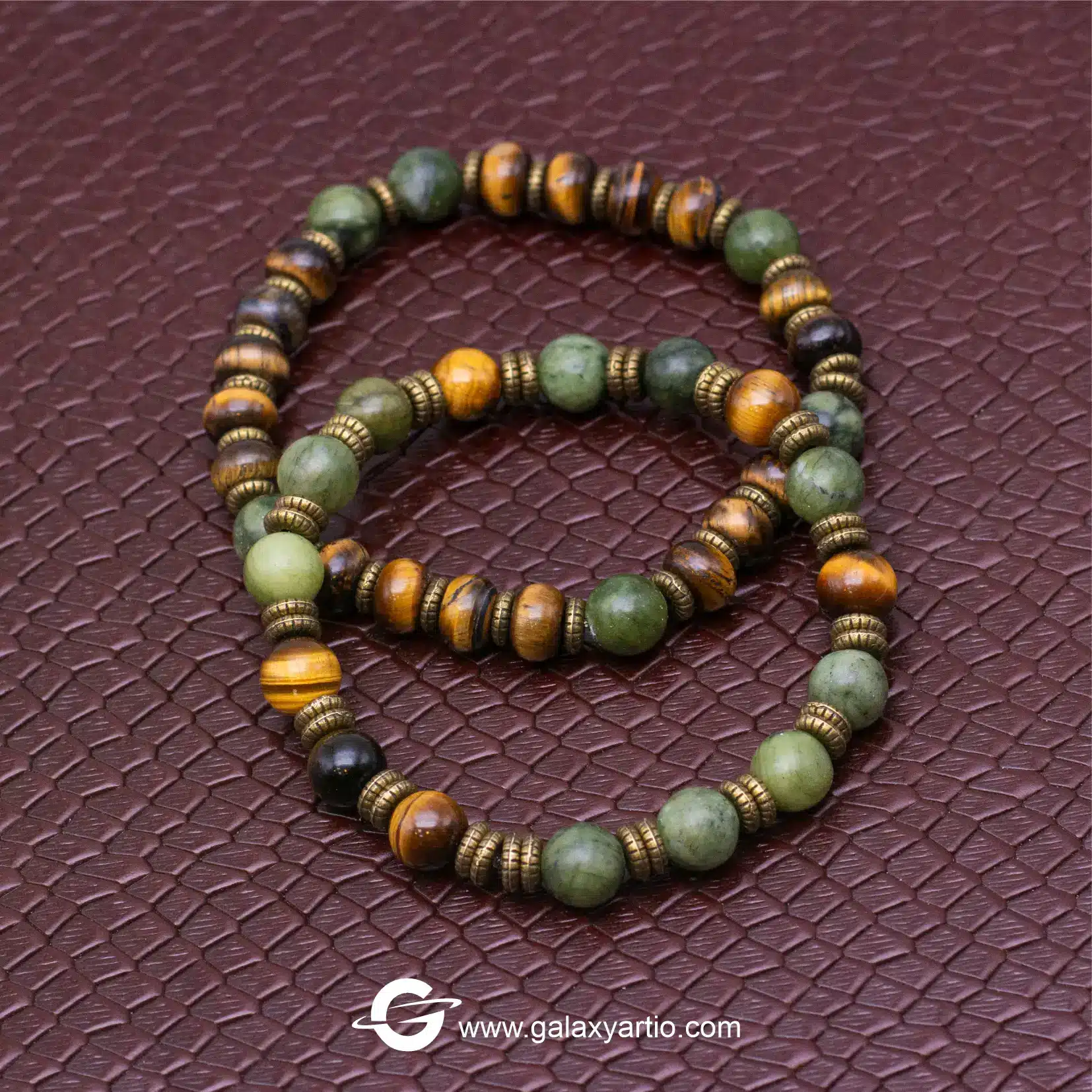 برای زیبایی بیشتر و افزایش جذابیت ظاهری، این دستبند با مهرههای برنزی خاص تزئین شده است. برنز از جمله فلزاتی است که به دلیل دوام و رنگ جذاب خود در طراحی زیورآلات کاربرد زیادی دارد. ترکیب برنز با سنگ های طبیعی جلوه ای خاص و متفاوت به این دستبند میبخشد.